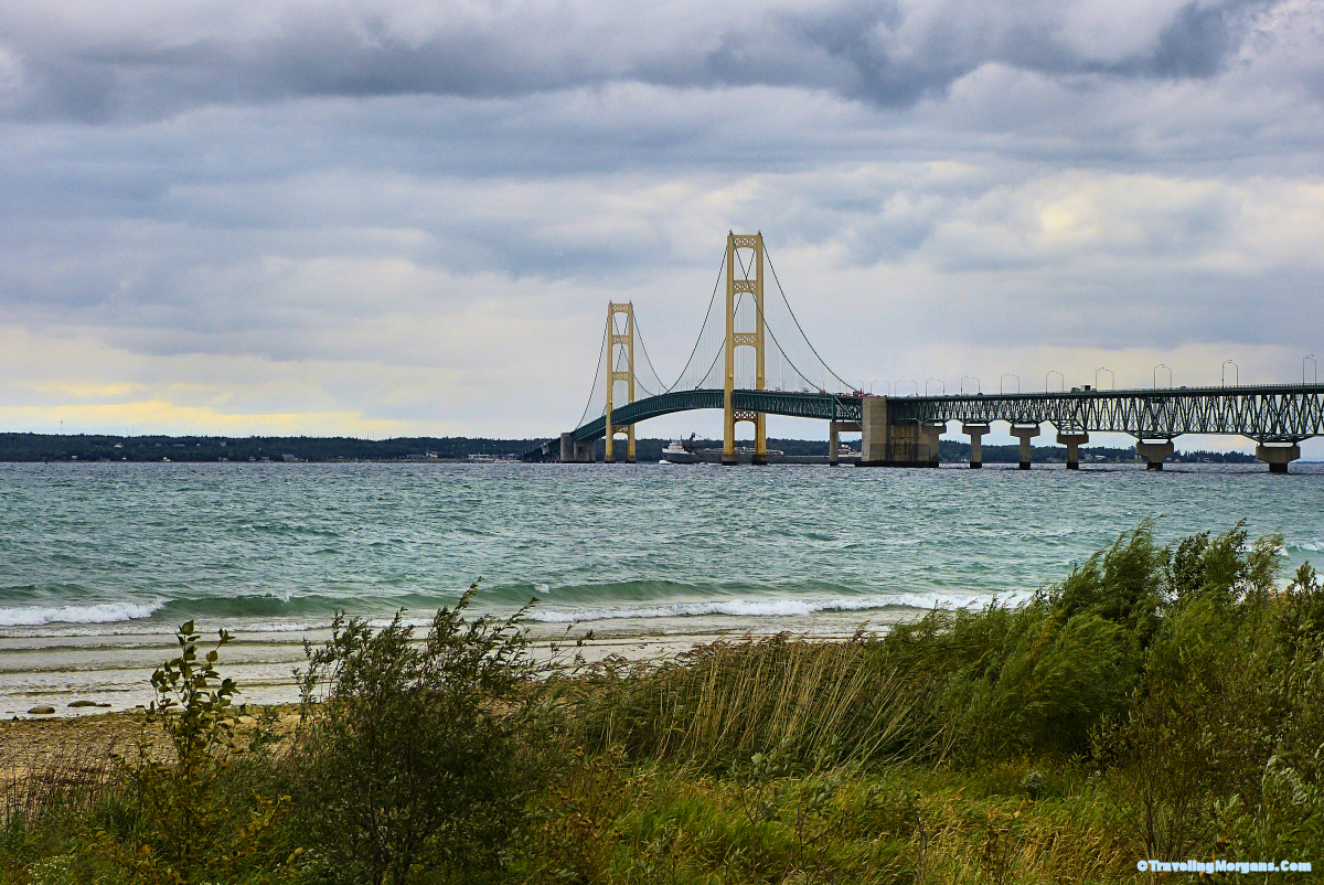 Bridge over the Straights of Mackinac where Lake Michigan meets Lake Huron in the state of Michigan.