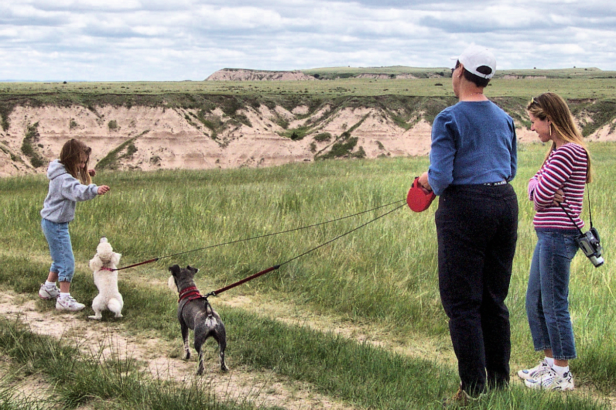 Roscoe with Harpo and Larry on Sheep Mountain Table, an undeveloped section of Badlands National Park in SD 2005.