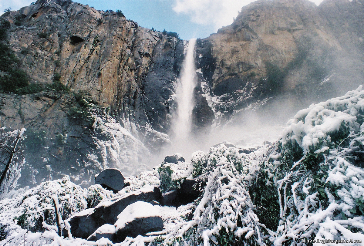 Closer view of Bridal Veil Falls,Yosemite National Park during an April snowstorm.