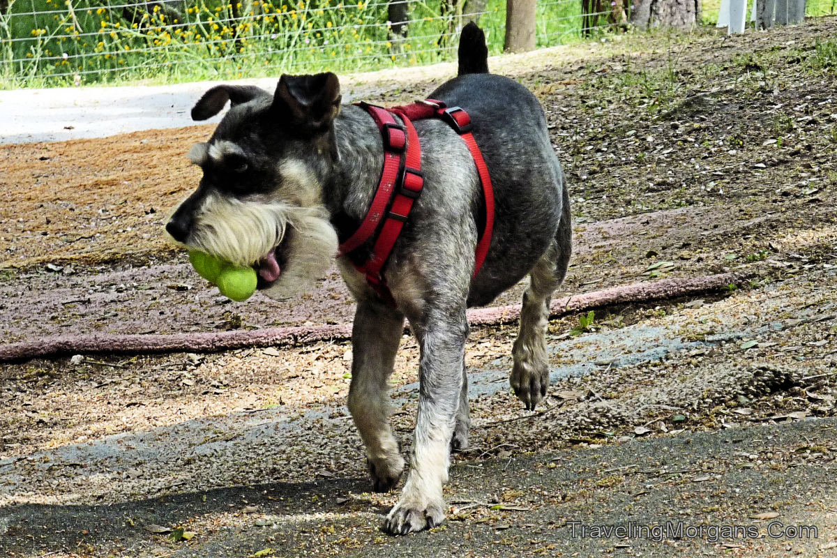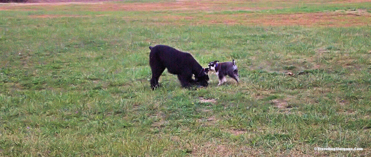 While preparing to go on the road, we stayed in a nearby campground. Roscoe found a friend by the name of Jake. Jake was a black 120 lb Giant Schnauzer that had no idea he was a big dog. Roscoe had no idea he was a small dog The played and talked constantly. They sounded the same, but Jake was 3 octaves deeper. They would run and thump chests. Roscoe was always surprised that he went flying instead of Jake. Basic physics was not Roscoe's strong point. They both had loads of fun.