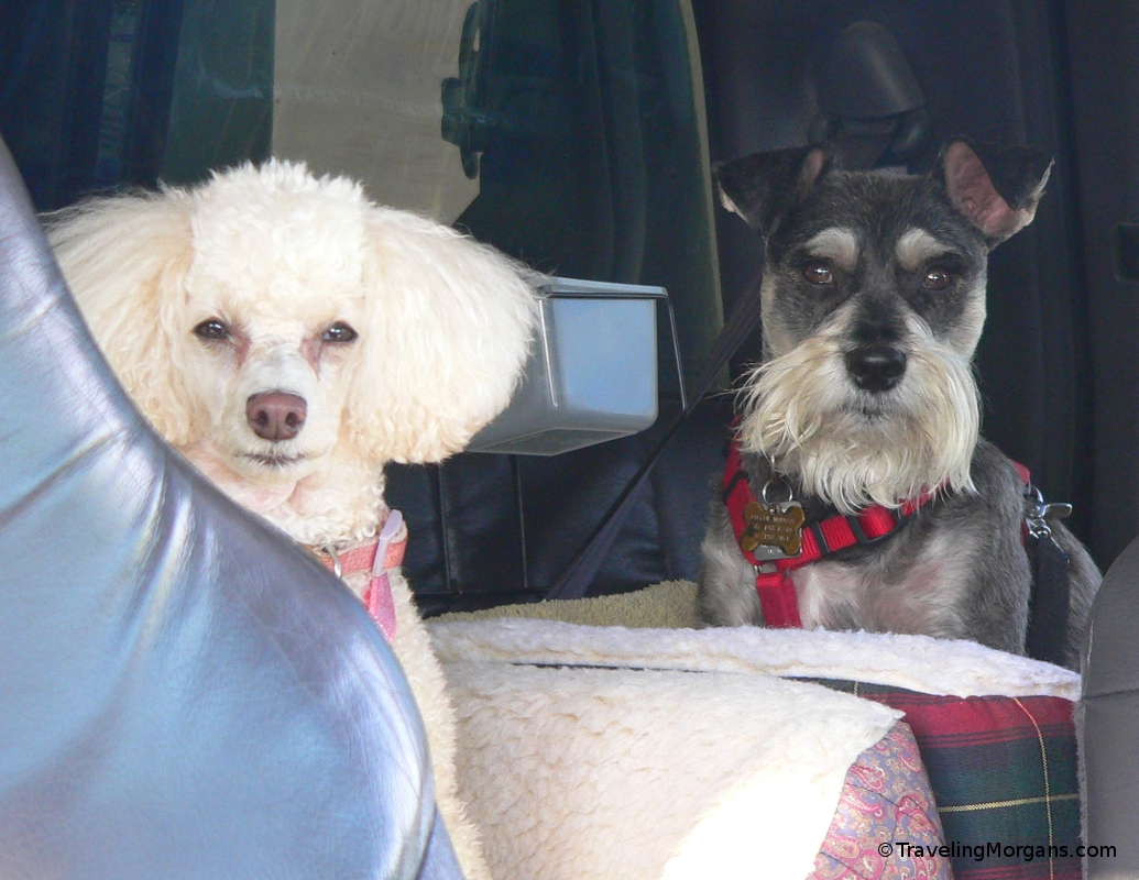 The Traveling Morgans used dog seats and a harness hooked to a seat belt. Roscoe and Harpo rode in the extended cab (2005).