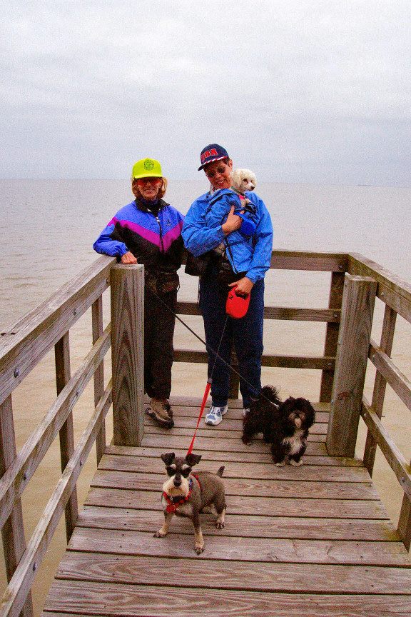 Roscoe and Harpo with Phyllis and our friend Carolyn Walters and her dog Lucy at Aranasas National Wildlife Refuge, TX in 2005. You can see Roscoe's "protect" posture.