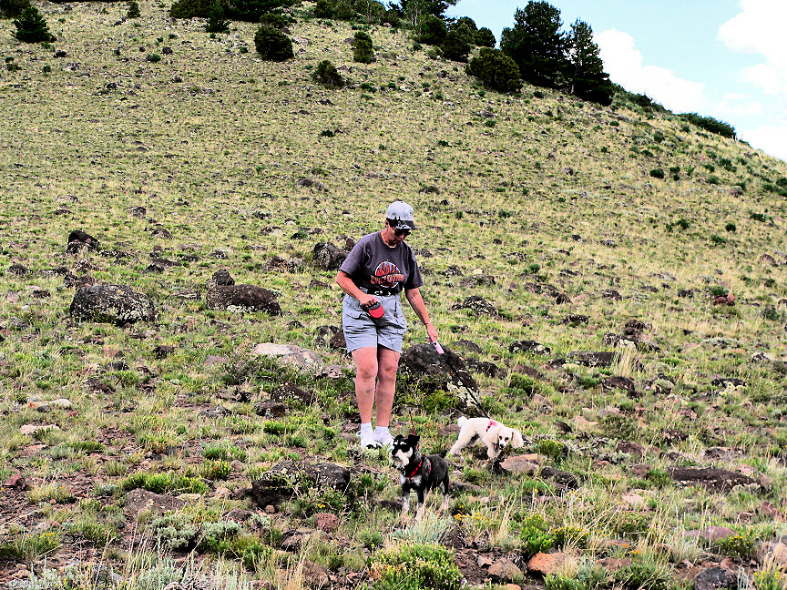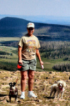 Roscoe&Harpo with Phyllis at Heddy Draw lookout with Mt. Coolidge in the background, Custer State Park in SD 2014.