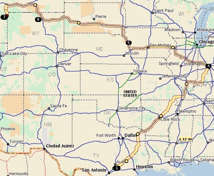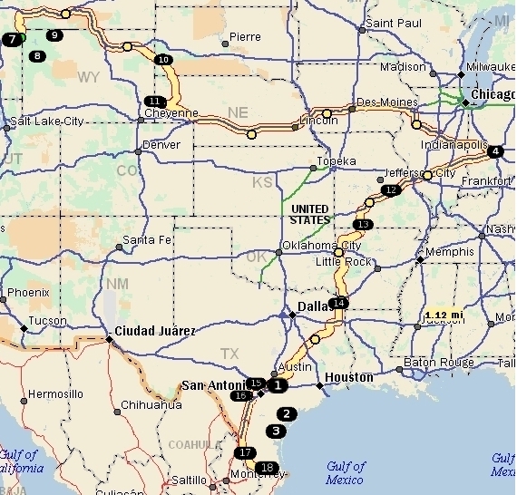 Our trip north from San Marcos, Texas, (upper map reference