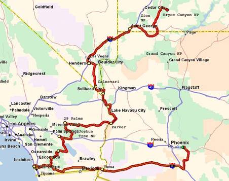 We left Apache Junction (near Superstition Mountains and Phoenix) in mid March and traveled to the Pacific Ocean. We were investigation some possible jobs for the following Winter. We also wanted to check out one city we thought might be that rarity — a city suitable for people who like to be out of doors. Namely San Diego. After a few days, we elected not to spend additional time in San Diego. None of the job possibilities turned into jobs, but we enjoyed checking out some sections of southern California , the Arizona– California border and southern Nevada (links to these are coming). The picture at left is the San Andreas fault from Key View in Joshua Tree National Park. |