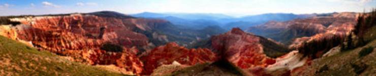 Southwest Utah is full of wonderful places to see. The Red Canyon section of Dixie National Forest, Cedar Breaks National Monument, Zion National Park, and Capitol Reef National Park are of few of these. Shown here is a composite view of the Chessman Ridge in Cedar Breaks National Monument — — actually multiple pictures stitched together by AutoStitch. |